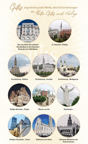 Wir möchten mit Ihnen gemeinsam ersehnte Träume erfüllen: Pilgerfahrten zu den bekanntesten Erscheinungs- und Gnadenorten der Welt. Orte, an denen Himmel und Erde sich berühren – wo Menschen seit Jahrhunderten Wunder, Heilungen und Bekehrungen erleben dürfen.